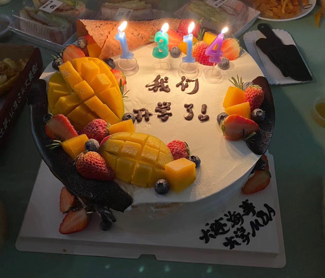 随后,我们进入预定好的包间,映入眼帘的是一大桌饕餮大餐,相机先吃,留存记忆。看到桌上有蛋糕,披萨,沙拉,薯条,啤酒,可乐,炸鸡等等琳琅满目。印象最深的是开学蛋糕,印有“我们开学了”,落款“大连海事大学MBA”,这种久违的仪式感令人感慨万千。